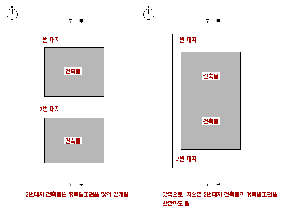 이때 1번대지를 매입하여 맞벽으로 건물을 지으면 2번대지에 지어지는 건물이 일조권 적용이 안되므로 수익률이 올라갑니다.