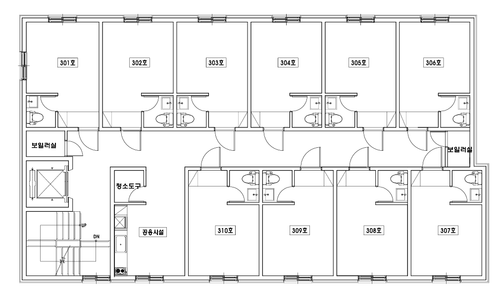 위 평면은 32개의 실과 공용실 하나로 구성되어 있는 다중주택으로 상담해드리고 실제로 운영하고 있는 다중주택입니다.